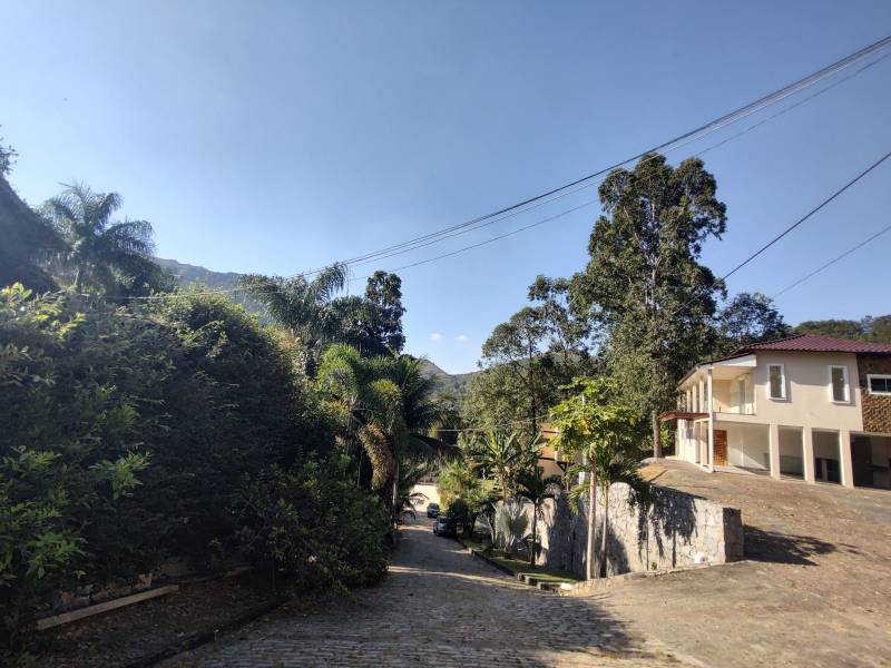 Rua arborizada de paralelepípedo, casa com muro de pedras.