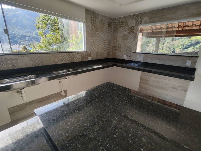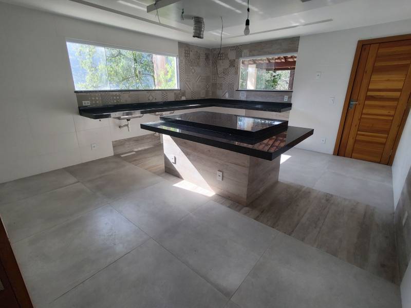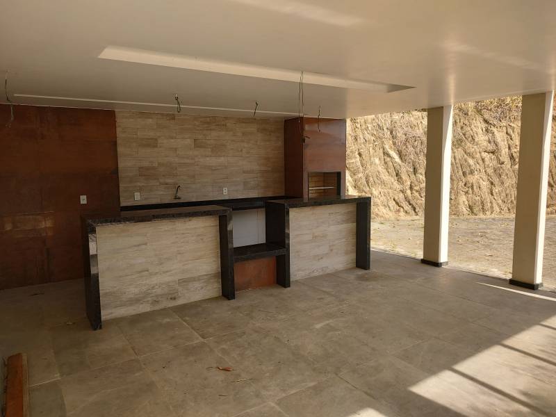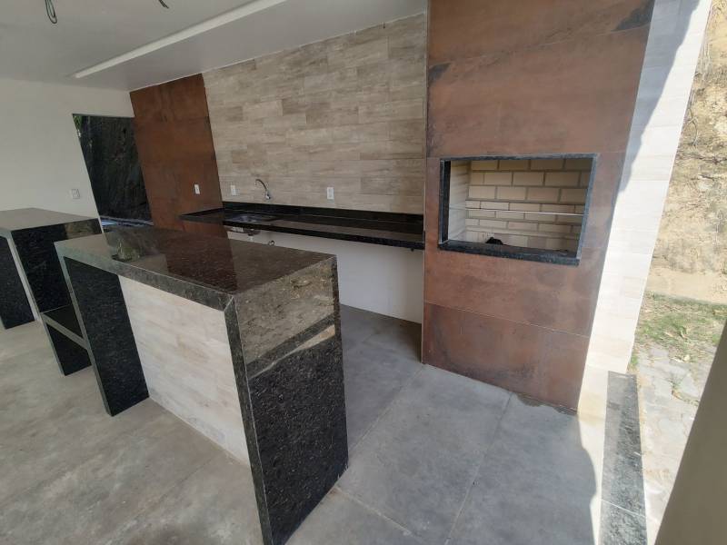 Andar inferior: 1 quarto, sala grande (teto com rebaixamento para iluminação embutida e portas de madeira) , cozinha grande com ilha central de granito, banheiro com pia de granito e blindex, área gourmet externa com churrasqueira, quintal amplo, área de serviço na parte de trás e deck livre para possível ofurô.