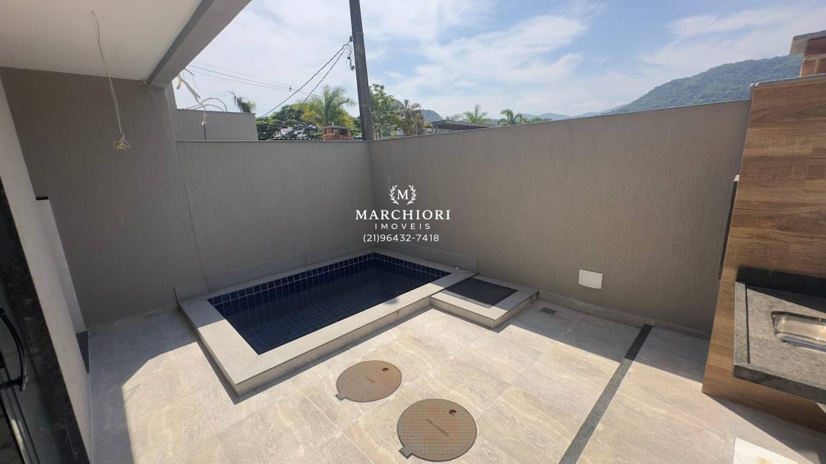 Oportunidade única! Linda casa duplex em condomínio fechado e seguro, localizada em Vargem Pequena, RJ. Com 240m² , este imóvel oferece 3 suítes, piscina com cascata, espaço gourmet e um acabamento impecável.